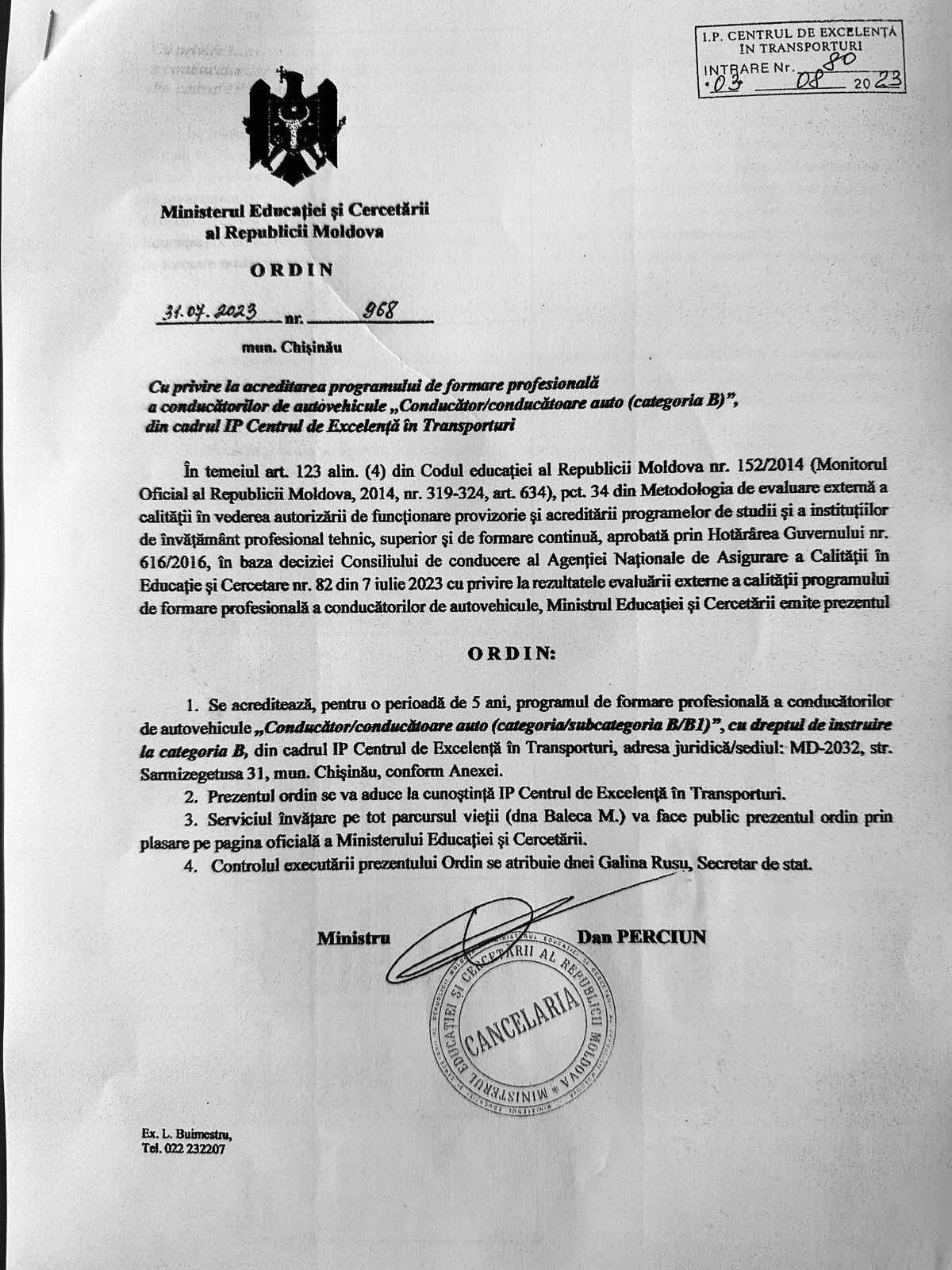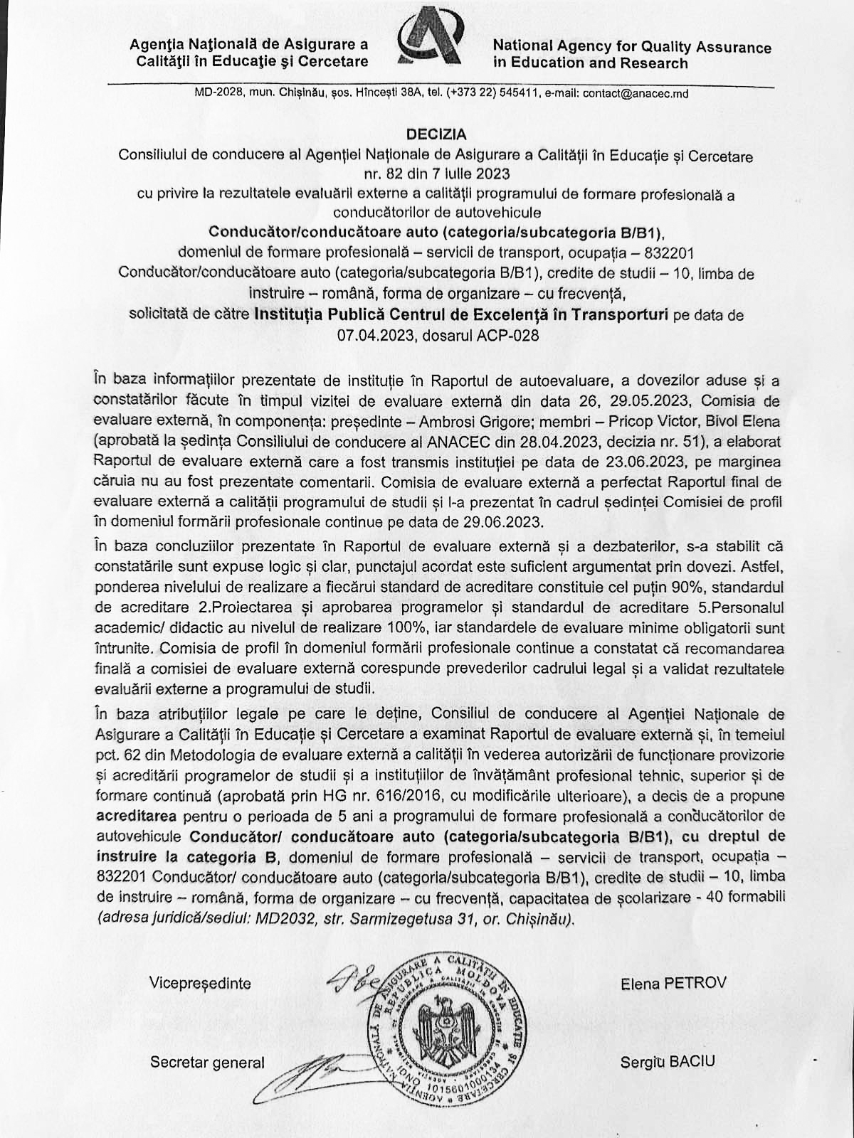 I.P. Centrul de Excelență în Transporturi în baza deciziei Consiliului de Conducere al Agenției Naționale de Asigurare a Calității în Educație și Cercetare nr.82 din 07 Iulie 2023 cu privire la rezultatele evaluării externe a calității programului de formare profesională a conducătorilor de autovehicule și ordinul Ministerului Educației și Cercetării al Republicii Moldova  nr.968 din 31.07.2023 este acreditată pentru o perioadă de 5 ani la programul de formare profesională a conducătorilor de autovehicule ,,Conducător/conducătoare auto (categoria/subcategoria B/B1)” cu dreptul de instruire.