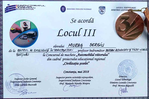În perioada 09-11 mai 2018, o delegaţie din cadrul instituţiei publice Centrul de Excelenţă în Transporturi, formată din profesorii Tîltu Vitalie, Berzan Alexandru, Plîngău Ghenadie şi elevii Blaga Andrei (gr. ET145), Muraş Sergiu (gr. ET143) au participat la Proiectul Educaţional Regional Civilizaţia şoselei, desfăşurat în incinta Liceului Tehnologic Dimitrie Leonida din Constanţa, România. Concursul a vizat şi organizarea unei expoziţii de machete.